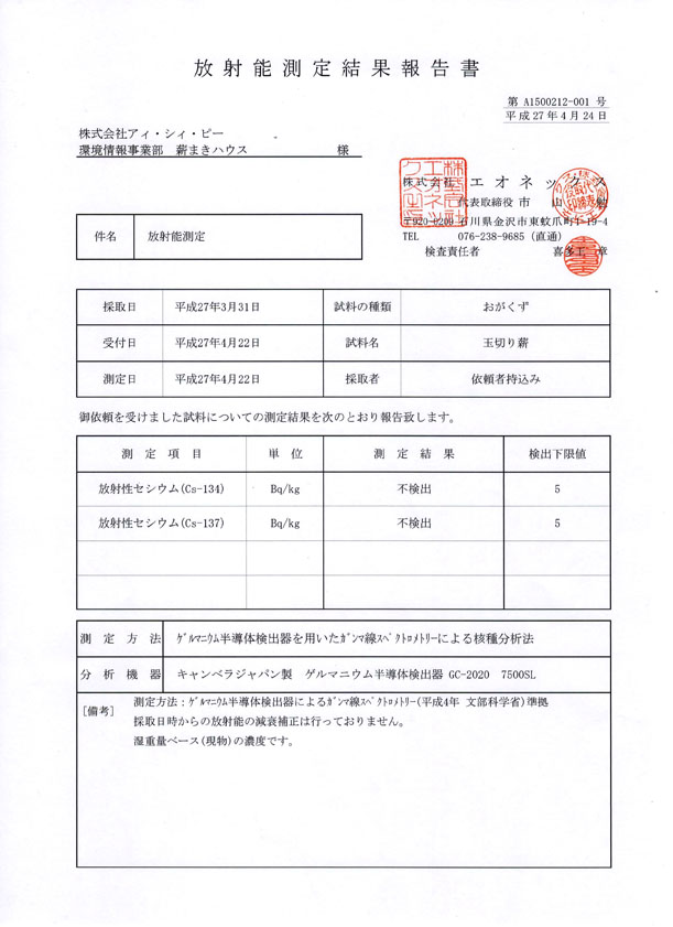 当店の薪は、石川県・富山県で伐採された雑木から生産されていますが、薪ストーブユーザーの皆様により安心して当店の薪をご利用いただけるよう、ご希望のお客様に無料で産地証明・放射能測定結果表を発行しております。